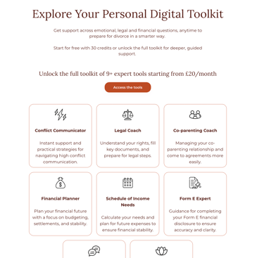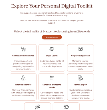 We created a suite of AI tools to support divorcees and their coaches during the divorce process. The B2C offering includes AI tools only, as well as coaching support options.